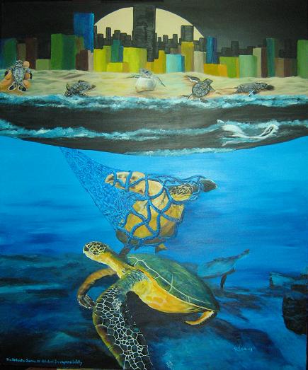 This painting depicts the awareness of the “Recipe For Disaster” that is affecting us all. Global warming is being caused by this Recipe and is now showing great impacts to the blue heart of the planet. From Oil to Plastic the industrial actions have created some very noticeable reactions that we cannot put a blind eye towards anymore. The turtle is depicted in this painting since all seven species are either threatened and/or endangered due to the industrial revolution. I believe from my research doing this painting and many others is that in the last 50 to 60 years we have forced the decline of 90% of all our natural resources and species on this planet.