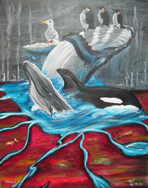 I vote for the painting titled, “Defcon1” because I think it demonsrates how deffenceless the ocean animals are to the deteriating affect of our modern society. It’s like the animals are in a far off land out of site & mind of our world.