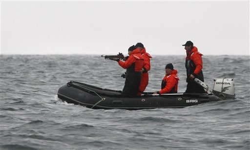 Associated Press: Russian Prime Minister Vladimir Putin holds a crossbow as he sits on a rubber boat at the Olga Harbor of Kamchatka Peninsula during a scientific expedition, to study grey whales on Wednesday, Aug.25, 2010.
