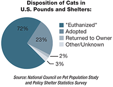 “Euthanasia” * in animal control pounds and shelters is the number one documented cause of death of all cats in the U.S. The most comprehensive study to date indicates that 72% of all cats entering these facilities are killed. Just 23% are adopted, and only 2% are reunited with their owners.