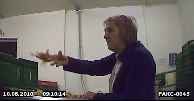 » Life and death: This woman is sorting males from females to catch any who were missed in the gassing room and is pictured flinging a male chick from the conveyor belt into a crate