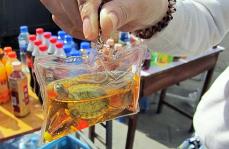 According to The Global Times, these keyring accessories containing live animals are widely available and sold publicly in subway stations and on sidewalks. Potential buyers (read as animal-abusers) have the choice between a living Brazil turtle or two small kingfish, sealed in an airtight package along with some colored water. One vendor claimed that the trapped creatures “can live for months inside there” because the water contains “nutrients,” though veterinarians have already disputed this claim.