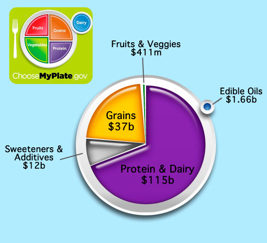 The food plate looks healthful enough, but federal incentives to farmers reflect an entirely different agenda. In large part, the government pays farmers who grow food for animals that become meat.  U.S. farm policy grew out of the economic hardships suffered by Midwestern farmers in the 1930s due to unpredictable swings in agricultural markets and the desire to protect the national food supply. Many critics feel the policy is no longer relevant and should be redesigned to promote healthful eating.  Of the roughly $200 billion spent to subsidize U.S. commodity crops from 1995 to 2010 (commodity crops are interchangeable, storable foods such as grains and certain beans, and cotton), roughly two-thirds went to animal-feed crops, tobacco and cotton. Roughly $50 billion went to human-food crops, including wheat, peanuts, rice, oil seeds and other crops that become sweeteners, according to a database compiled by the Environmental Working Group, an advocacy group. About $12 billion went to crops that were turned into ethanol, a use that is consuming a growing share of the harvest.Farmers who grow fruits, vegetables and tree nuts, on the other hand, receive no regular direct subsidies, though there are some small programs that aid apple farmers and other growers. The government sometimes buys excess canned produce and uses it in school lunch programs and emergency food banks.