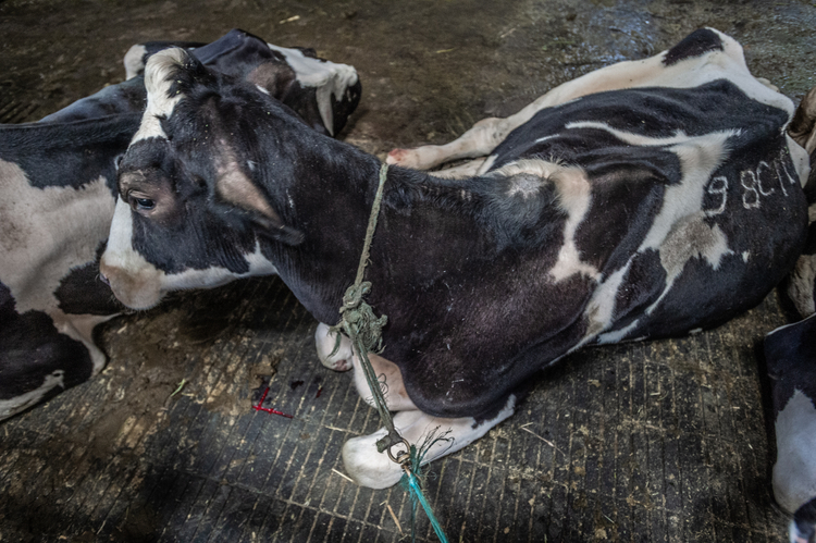 Young calves paced and cried out. Being separated from their mothers and having milk restricted is highly distressing and dangerous for calves. When they were finally fed, they were often shown no patience. Some were thrown and hit and one was kicked in the face for not taking to the drinkers fast enough.