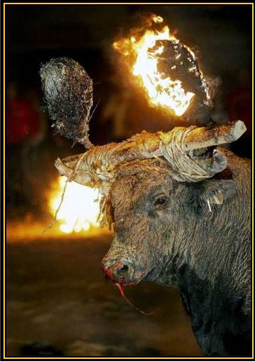 Every year on the weekend closest to November 13, a bizarre and nightmarish festival known as “Toro Jubilo” is held in Soria, Spain. During this horrible event, residents affix balls of flammable tar (or pitch) to the horns of terrified, restrained bulls. The bulls’ horns are then set alight, and the panicked animals—either tied to stakes in public squares or released to run madly through the streets—are left to burn in agony. For hours, the tar burns like a bonfire on the bulls’ heads, scorching their faces, eyes, and bodies. Many burning bulls reportedly crash into walls in agony and blind terror. Their carcasses are later divided among the participants for consumption—residents apparently believe that consuming the flesh of the tortured animals provides them with fertility and invincibility. Please learn more about this horrifying ritual by clicking here.