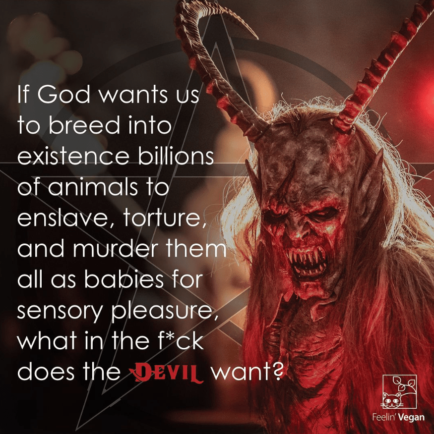 All I gotta say is, if you use religion to condone cruelty, intolerance, and/or hatred (and honestly – you people only exploit religion when attempting to justify bad beliefs and deeds, and you know it), you’re just using religion as confirmation bias and interpreting it to support/sanctify YOUR cruelty, intolerance, and hatred. Stop blaming God for your faults, He didn’t create animals, give them the capacity to suffer, experience pain and fear, and the desire to NOT die, only to will humans to cause such against TRILLIONS (including marine life) each year alone. I mean, jfc, what a violent and malevolent SatanGod you worship are.